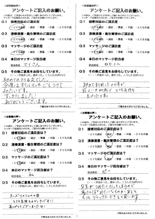 セラピスト「個人」に対するご指摘やご指導※は投稿による公開は控えていますが、全て成長の機会として内部ではしっかり活用させていただいております。 課題のない仕事はないと考えており、どうかこれからもアンケートへのご協力をよろしくお願いします。 ※月2~3件程度