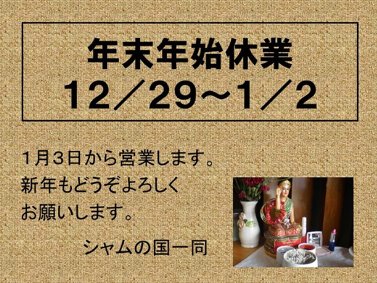 さて、年中無休のシャムの国は年末年始のみお休みをいただいてます。