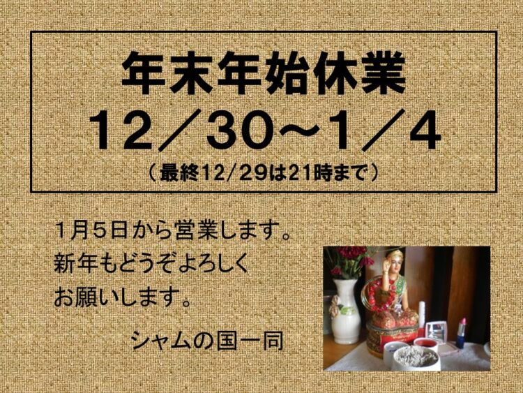拝啓 師走の候、ますますご健勝のこととお喜び申し上げます。平素は格別のご高配を賜り、厚くお礼申し上げます。さて、シャムの国は年末年始のみ休業をいただいております。この年末年始の休業日は下記の通りです。 お礼ならびに新年もどうぞよろしくお願い致します。敬具12/29は23時まで営業に変更しますFollow me!FacebookXBlueskyHatenaCopy