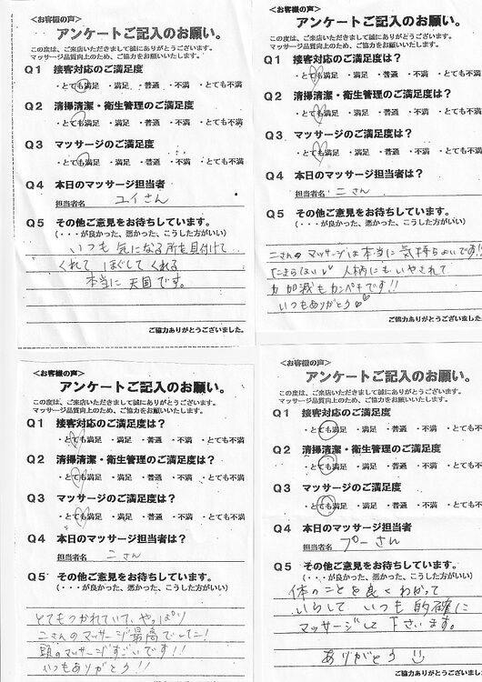 セラピスト「個人」に対するご指摘やご指導※は投稿による公開は控えていますが、全て成長の機会として内部ではしっかり活用させていただいております。 課題のない仕事はないと考えており、どうかこれからもアンケートへのご協力をよろしくお願いします。 ※月1件程度