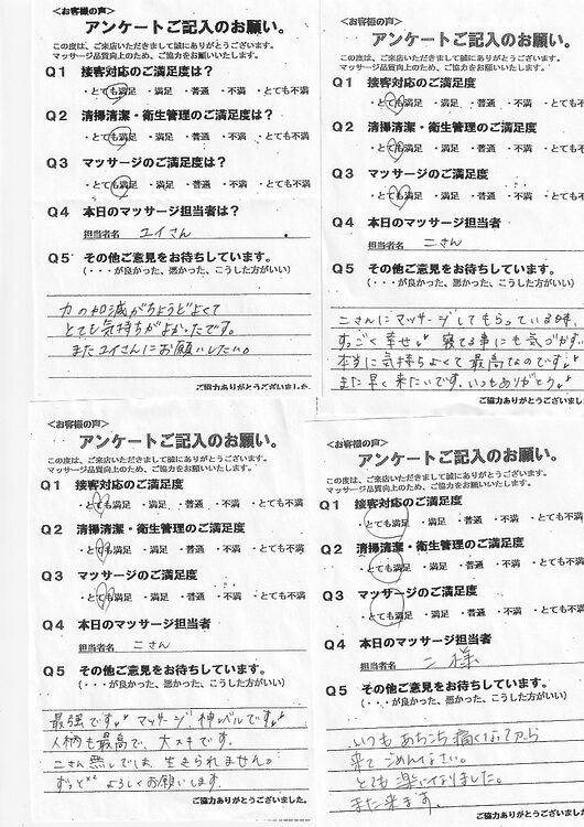 セラピスト「個人」に対するご指摘やご指導※は投稿による公開は控えていますが、全て成長の機会として内部ではしっかり活用させていただいております。 課題のない仕事はないと考えており、どうかこれからもアンケートへのご協力をよろしくお願いします。 ※月1件程度