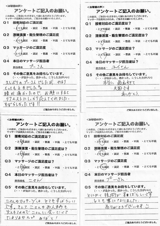 セラピスト「個人」に対するご指摘やご指導※は投稿による公開は控えていますが、全て成長の機会として内部ではしっかり活用させていただいております。 課題のない仕事はないと考えており、どうかこれからもアンケートへのご協力をよろしくお願いします。 ※月1件程度