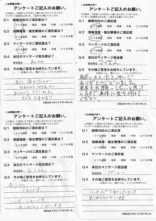 セラピスト「個人」に対するご指摘やご指導※は投稿による公開は控えていますが、全て成長の機会として内部ではしっかり活用させていただいております。 課題のない仕事はないと考えており、どうかこれからもアンケートへのご協力をよろしくお願いします。 ※月1件程度